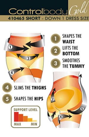 Shaping short with high compression providing a firm level of support. Soft microfiber and silicon on the waist. Jacquard panelled and scalloped edge. Shapes the waist lifts the bottom shapes the hips slims the thighs and smooth the tummy. Anti-bacterial gusset. Item comes packaged in a Control Body box.