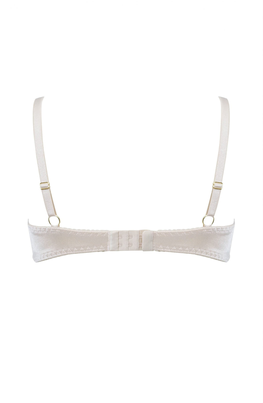 Delicate underwired bra with lightly padded cup to provide shape and support. Adjustable straps with gold coloured metal fittings. Lovely lace and centre ring detail. Hook and eye fastener at the back with three adjustment positions.