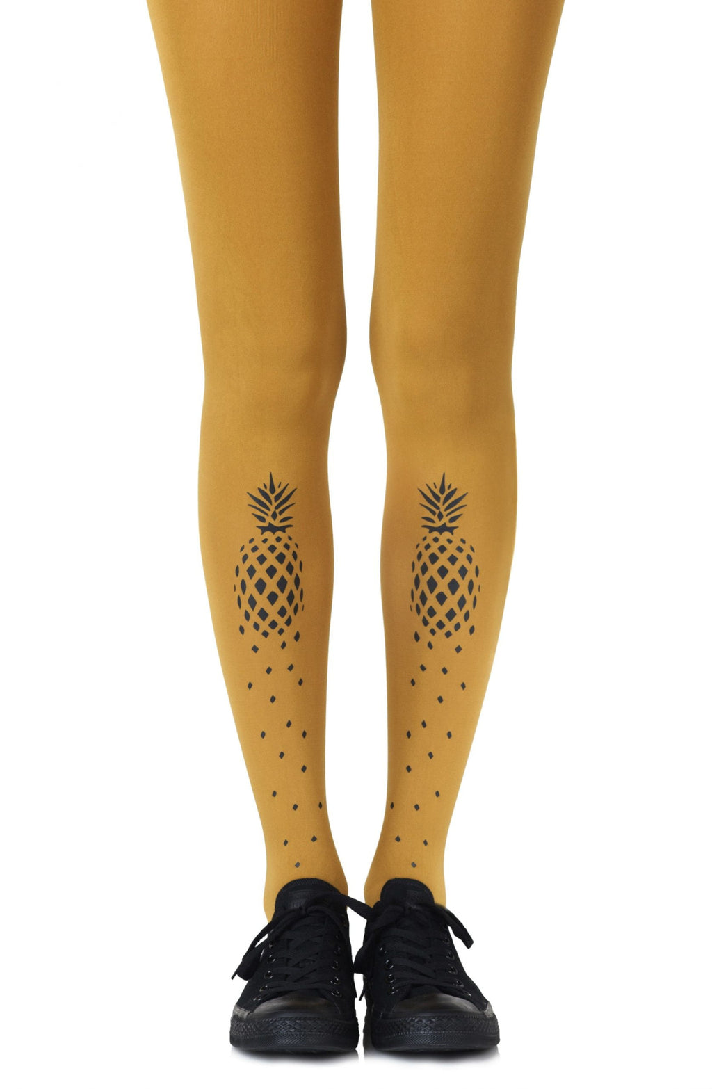 Tropical dreams in the middle of the winter? No worries! If You Like Piña Coladas will remind you of warmer places. Featuring a graphic print of the pineapple these tights are reversible. Colour: Mustard tights with Black print. Thickness: 120 denier. Unless they have X-ray vision no one will be able to see through these opaque tights. Is the party in the front or the back? You choose with reversible tights where to place all the fun. Hand print no two are the same.