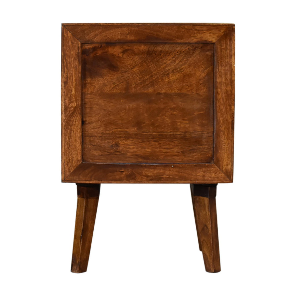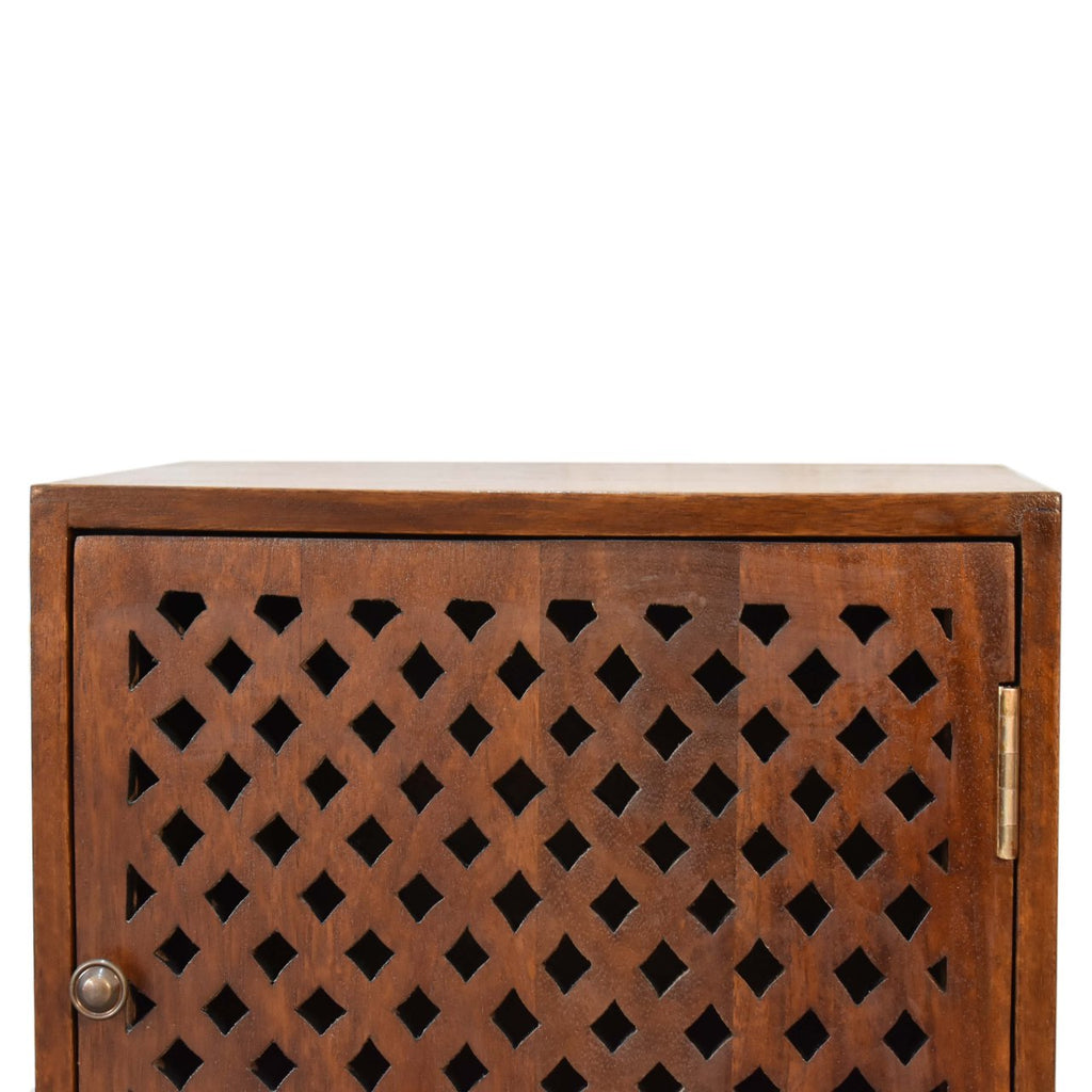 This stunning Arlo Bedside has been constructed from 100% solid mango wood and has a smooth chestnut finish. The main feature of this piece is the carved cutout door front which gives this piece its individual retro character, not forgetting a shelf inside for storage. It also features a shiny brass knob and stands on 4 nordic style legs.