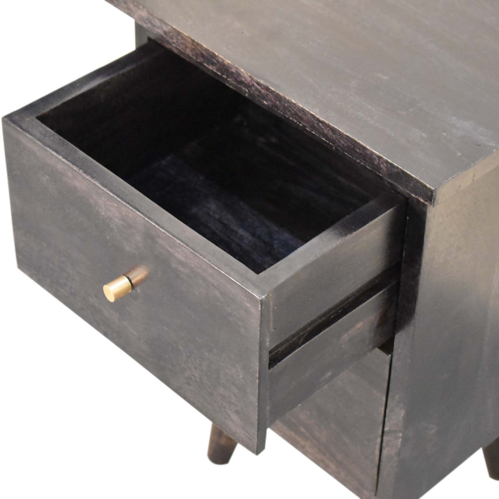This bedside table has been constructed from 100% solid mango wood and finished with a oak-ish finish top and legs. The body of the bedside has been finished in a hand-painted black paint and features shiny brass knobs on the 2 drawers for easy access. This bedside is bound to spice up your bedroom.