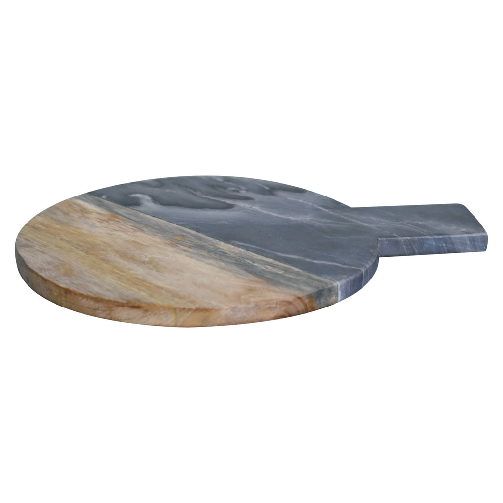 Bring a trendy and modern feel to any kitchen with this sleek and stylish round chopping board. With it's smooth and natural wood finish it is also combined with a smooth black marble top, making it convenient to cut and prepare different types of food on either side of the chopping board, it also has a handle making it easy to pick up and move around.