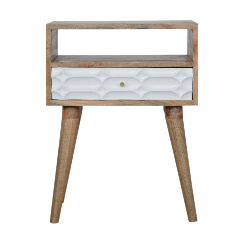 This beautiful bedside has been constructed from 100% solid mango wood in an oak-ish finish with unique white hand painted capsule style hand carved drawer fronts. It features 4 Nordic style legs and two deep drawers to take care of everyday utility items. This bedside table will add a lovely touch and lasting character to your bedroom.