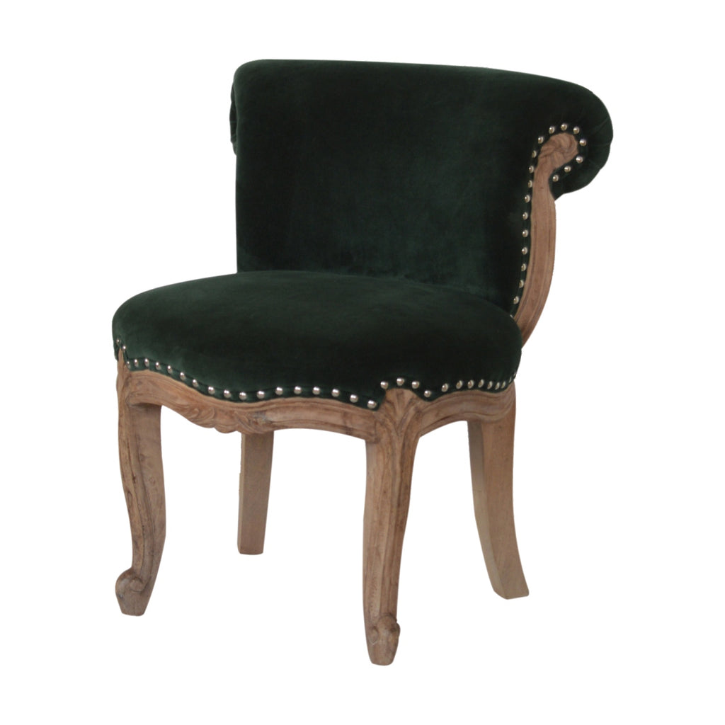 Add class and style to your home with this occasional chair. The upholstered emerald green cotton velvet fabric goes beautifully with the studded design giving the piece an overall unique and chic look. With solid wooden legs constructed from 100% solid mango wood in a sunbleach finish, the chair provides strength and durability and can be incorporated into different home settings and interiors.