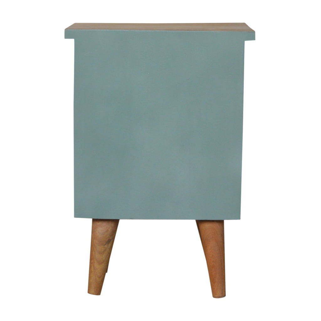 This bedside table has been constructed from 100% solid mango wood and finished with a oak-ish finish top and legs. The body of the bedside has been finished in a hand-painted green paint and features shiny knobs on the 2 drawers for easy access. This bedside is bound to spice up your bedroom.