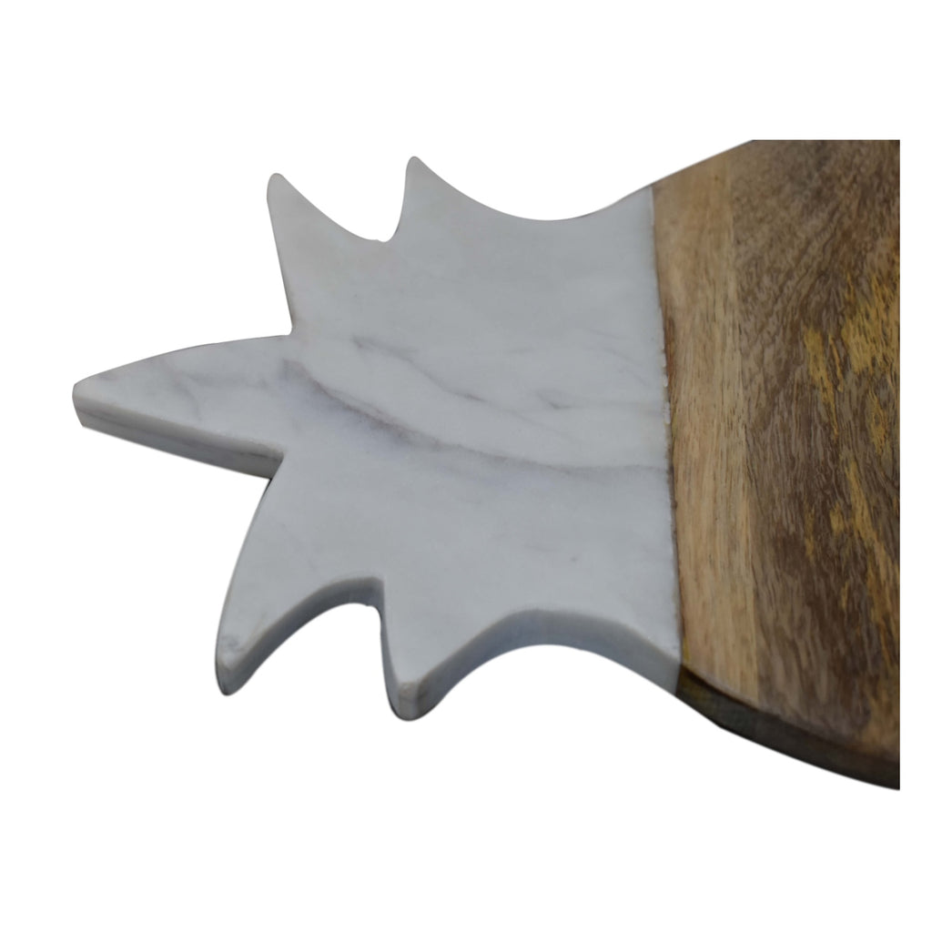 Bring a trendy and modern feel to any kitchen with this sleek and stylish pineapple chopping board. With it's smooth and natural wood finish it is also combined with a smooth white and grey marble top, making it convenient to cut and prepare different types of food on either side of the chopping board. Expect differences in texture, color, grains etc., as this product is extracted from a natural source. This is a natural configuration and should not be considered as a defect.