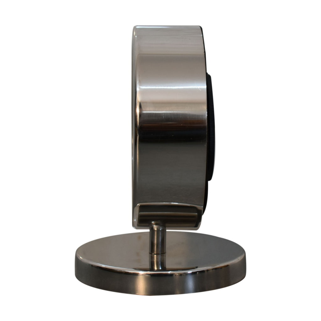 This round clock is a sleek addition to your bedside table. It offers a chrome frame and base with a simple face and overall minimalist look that will blend with many décor styles.This product is handcrafted individually and as every piece is unique please do expect variations in finish, texture, size and should not be considered as a defect.