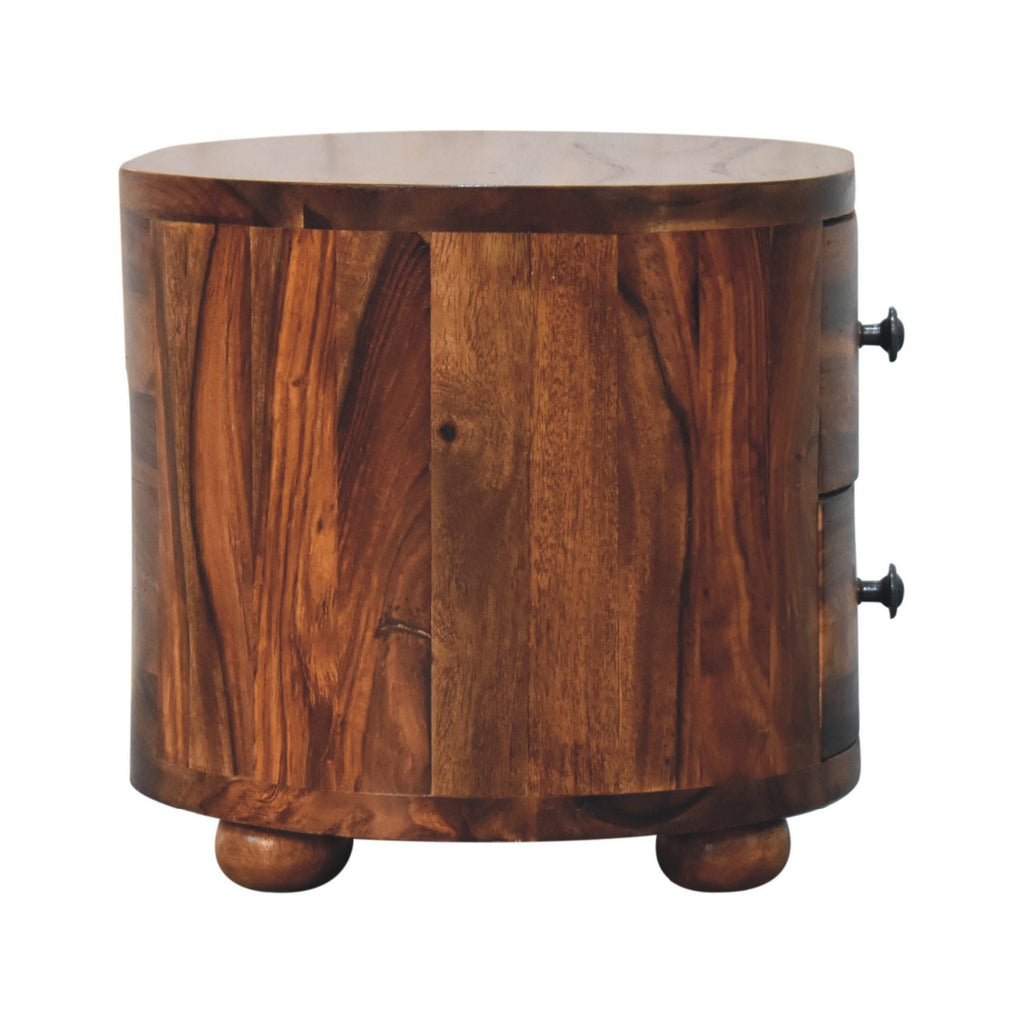 The round honey finish bedside is a unique piece of furniture thanks to its design and bun feet design, which will bring a modern and simplistic touch to your bedroom as well as providing storage space with 2 drawers. It is made of 100% solid sheesham wood, with a honey finish and natural grain pattern topped with a clear laquer for durability.