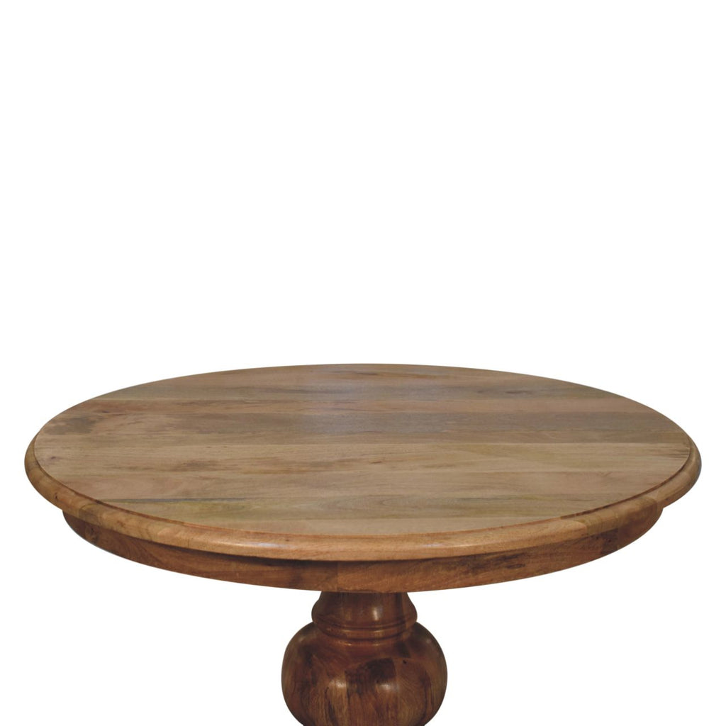 Create an elegant dining experience with this Round Turned Dining Table. Drawing inspiration from a classic French design it combines graceful curves with warm wood tones. Crafted from solid mango wood with an oak-ish finish this round table is the perfect piece for any dining room or kitchen. Every piece of furniture is individually handcrafted and includes swing care tickets explaining the cautions and aftercare instructions.