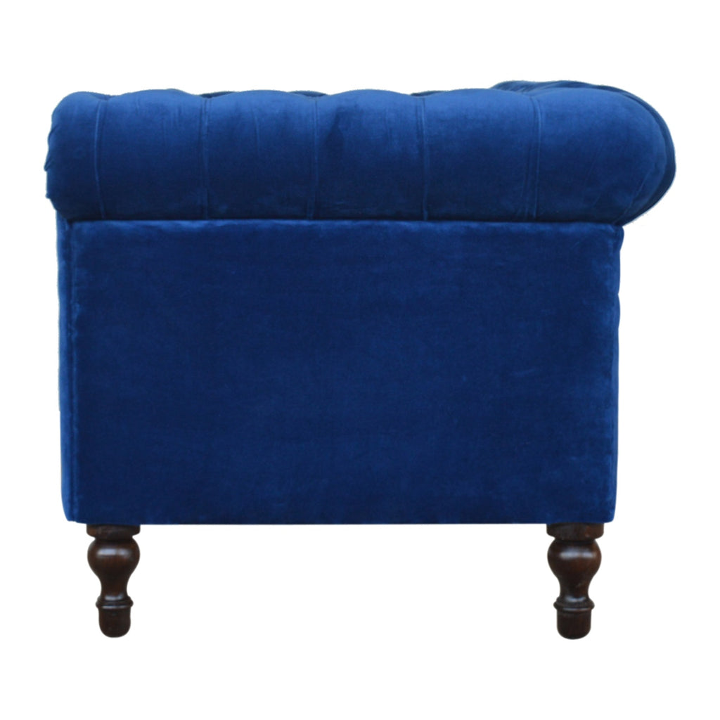 Sink into the sumptuous royal blue velvet of this 2‑seater Chesterfield, where classic button‑tufting meets modern flair. The solid mango wood legs, finished in walnut, add sturdy elegance to any living space. Deep, comfortable seating invites relaxed conversation while the rich colour brightens your décor. Crafted to last, this sofa blends timeless style with everyday practicality.