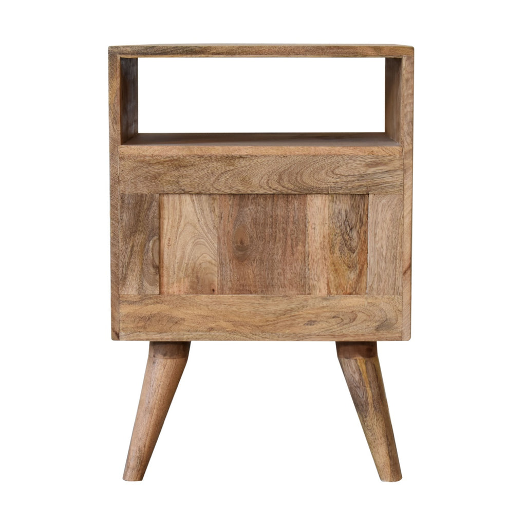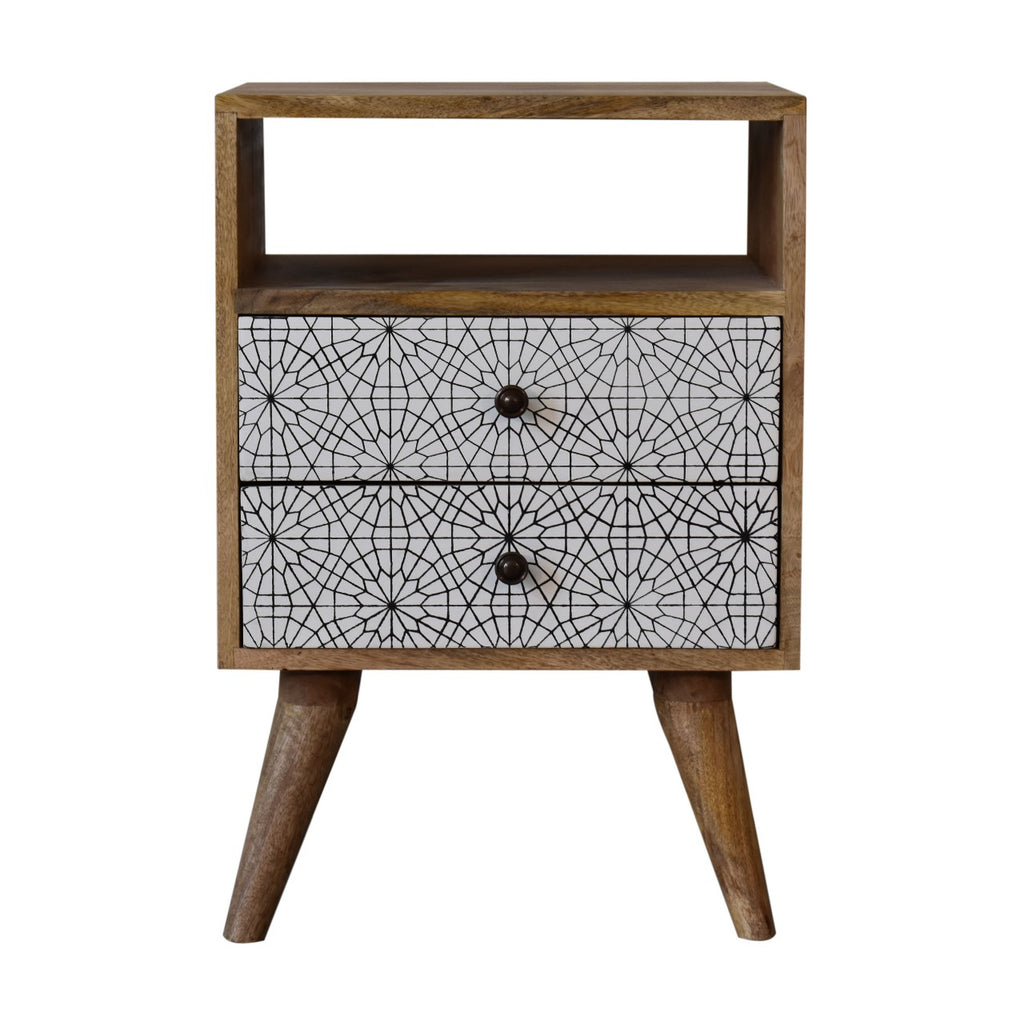 This 2 drawer bedside has been constructed from 100% solid mango wood and finished in a fine oak-ish finish body. The main features of this piece are the 2 screen printed drawer fronts which have a beautiful black and white geometric design giving the piece extra dimension and character. Useful storage is provided with the open slot allowing you to keep any bits and pieces close before bedtime. It also has 4 Nordic style legs and ample space on top for a lamp, photo frames or ornaments.