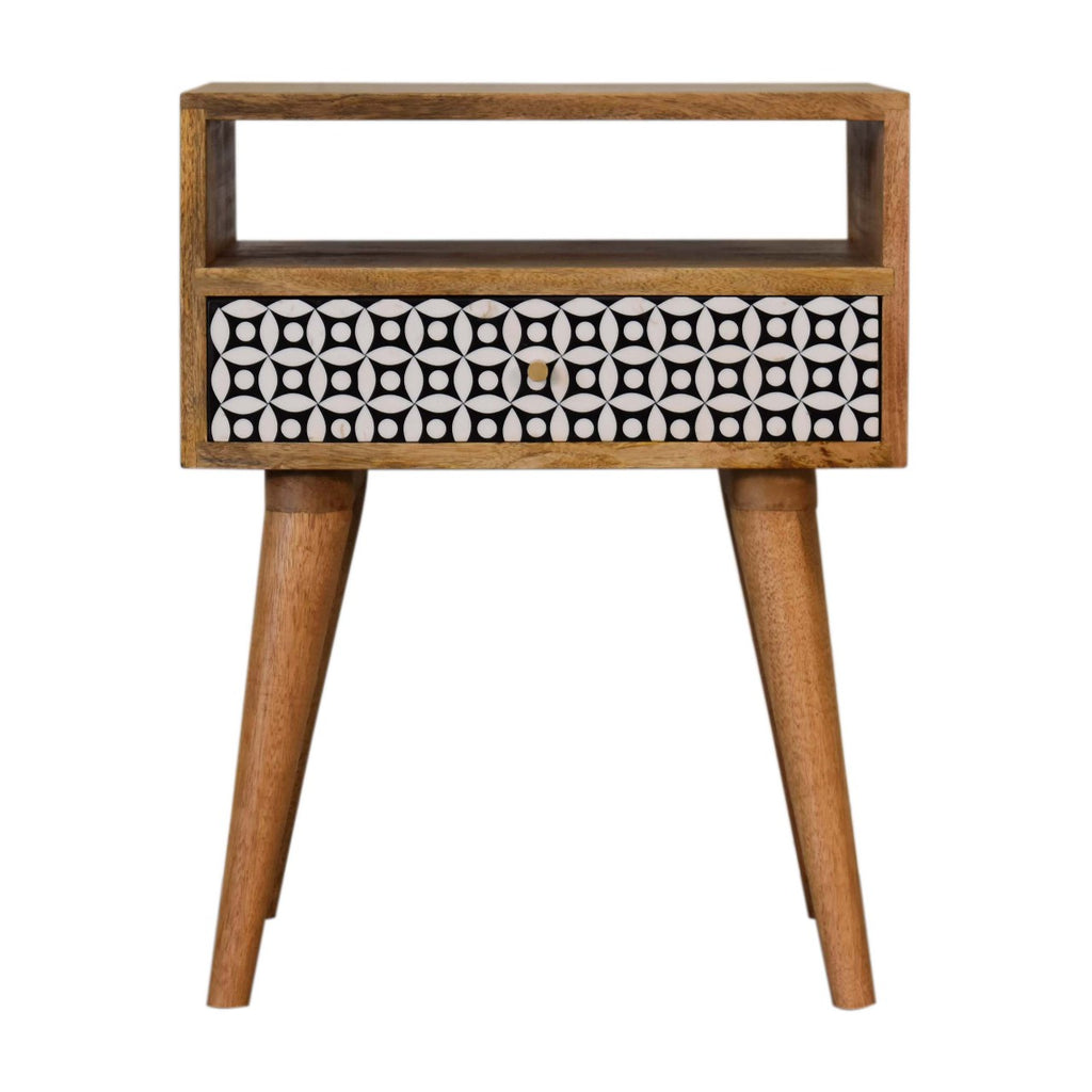 This bedside has been constructed from 100% solid mango wood and finished in a fine oak-ish finish body. It features a black and white pattern drawer front which is bound to uplit your bedroom and allow you to store any bits and pieces discreetly along with a open slot for extra stroage. It also has 4 Nordic style legs and ample space on top for a lamp, photo frames or ornaments.