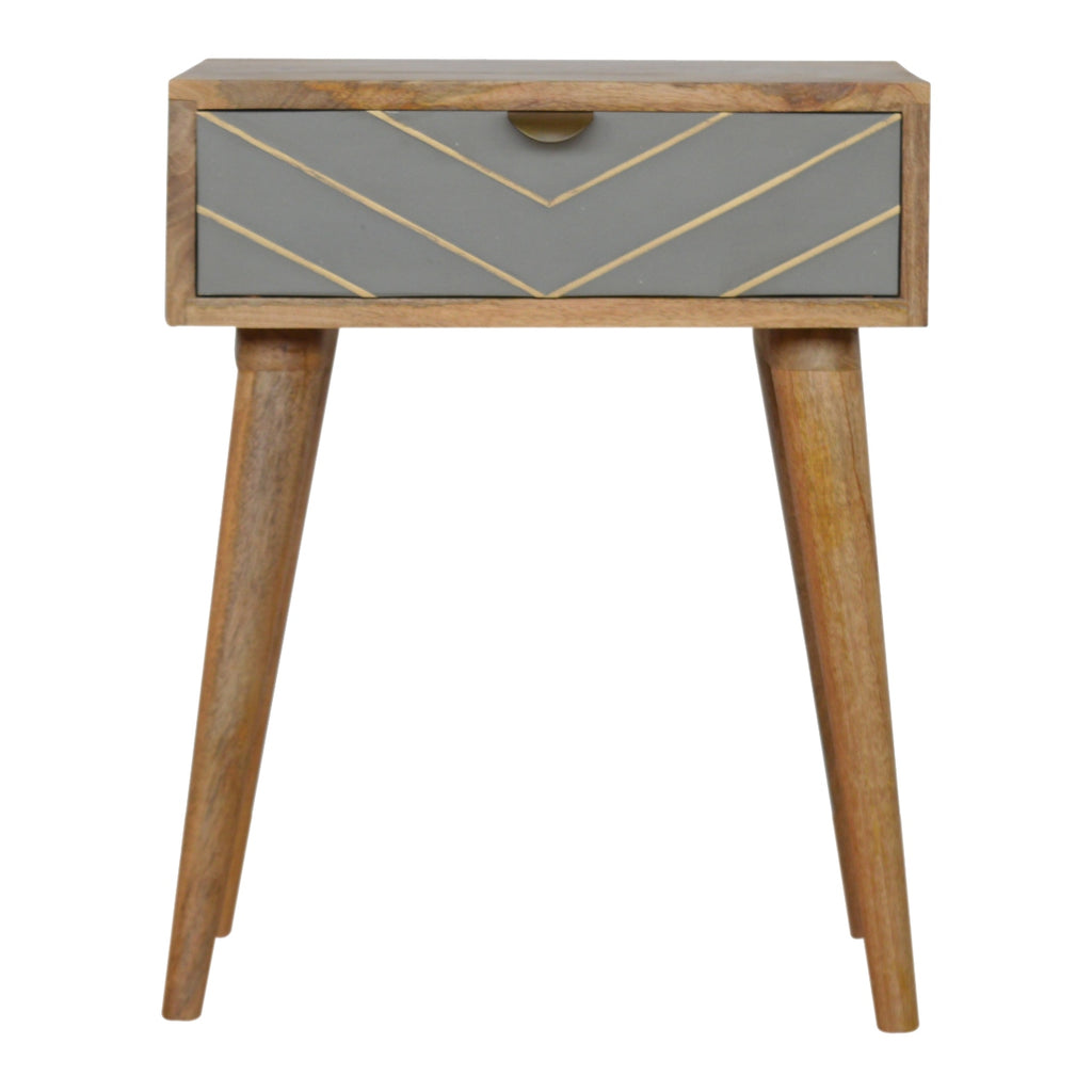 This bedside has been inspired by a clean and modern finish design. It has been constructed from 100% solid mango wood in an oak-ish finish and its main feature is the grey cement drawer front with a beautiful golden brass inlay and 4 gold Nordic style feet which compliment the wooden body perfectly. It has 1 drawer for storing any bits and pieces before bedtime and can be partnered with the other pieces from the collection or stand graciously alone.
