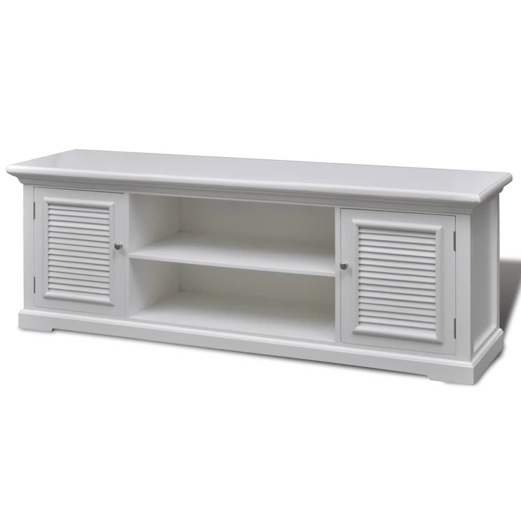 This elegant wooden TV stand in antique look with clean lines is a perfect addition to nearly any interior style, from ultra-modern lofts to casual family rooms. It will add a touch of style to your home theatre set-up. The TV console has four shelves with two doors, which provide out-of-sight storage for games, movies, music and other entertainment essentials. A further two shelves can accommodate different home entertainment systems, such as CD players, DVD players and DVR systems. The wide top surface of this TV cabinet makes it ideally suitable for showcasing a freestanding wide screen plasma or LCD television. Made from sturdy MDF and pine wood, the TV stand holds up well to everyday wear and tear. The white paint finish makes it easy to clean with a damp cloth.